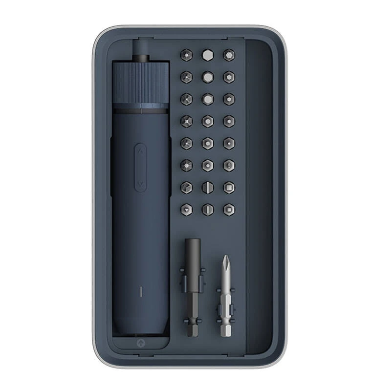 Wkrętak i bity zostały umieszczone w prostokątnym etui, wyróżniającym się minimalistycznym designem. Dzięki wbudowanym magnesom możesz je wygodnie przechowywać w jednym miejscu, bez obaw o zgubienie któregoś elementu z zestawu. Dodatkowo etui z łatwością otworzysz i zamkniesz.