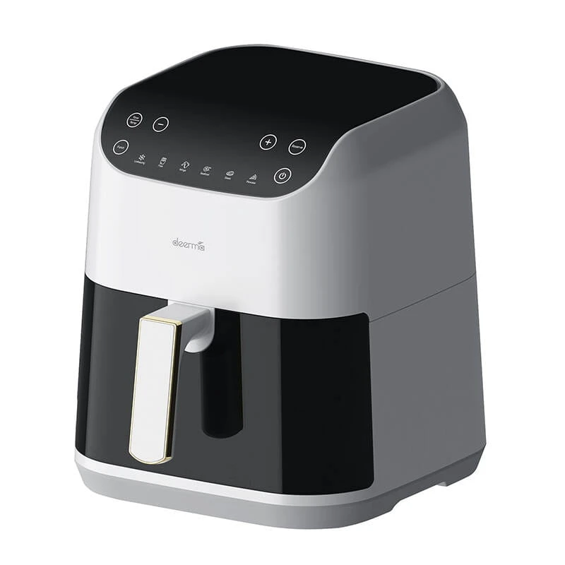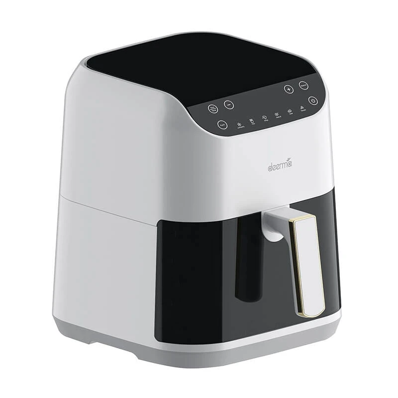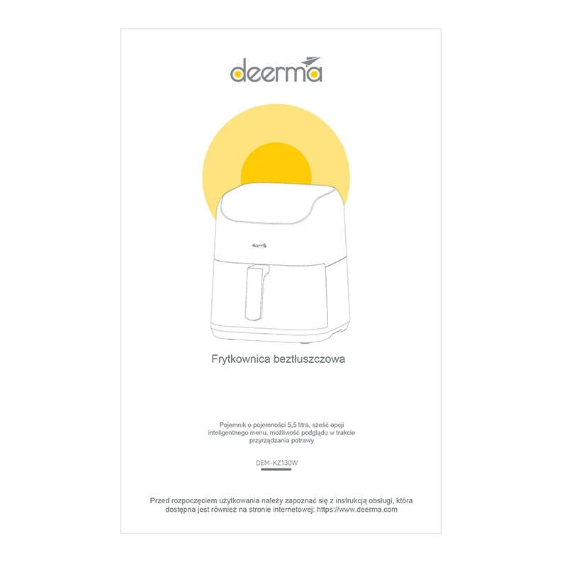 Deerma DEM-KZ130W to frytkownica o mocy 1300W, która wykorzystuje cyrkulujące w obiegu zamkniętym gorące powietrze, aby przygotować dla Ciebie pyszny posiłek. W trosce o Twoje bezpieczeństwo urządzenie zostało wyposażone w dynamiczną kontrolę temperatury NTC oraz uchwyt chroniący przed oparzeniem, aby korzystanie z niej było jeszcze przyjemniejsze. Poza tym frytkownica posiada przyciski służące do zmiany temperatury, ustawienia okresu odłożenia w czasie pracy nad daniem, wybrania menu, włączania i wyłączania.