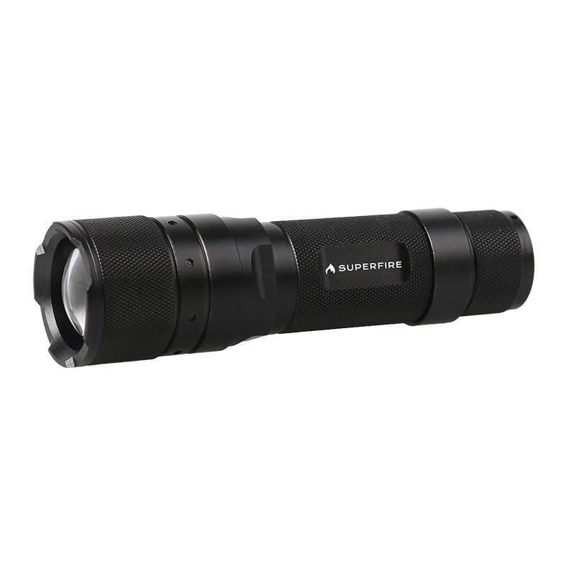 Latarka Superfire F3-L2 posiada możliwość skupienia wiązki poprzez wysunięcie głowicy latarki, dzięki czemu zobaczymy oświetlony obszar bardzo dokładnie.