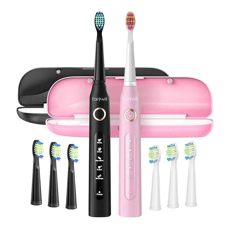 Szczoteczki soniczne do zębów z zestawem końcówek i etui FairyWill FW-507 (Czarna i Różowa)