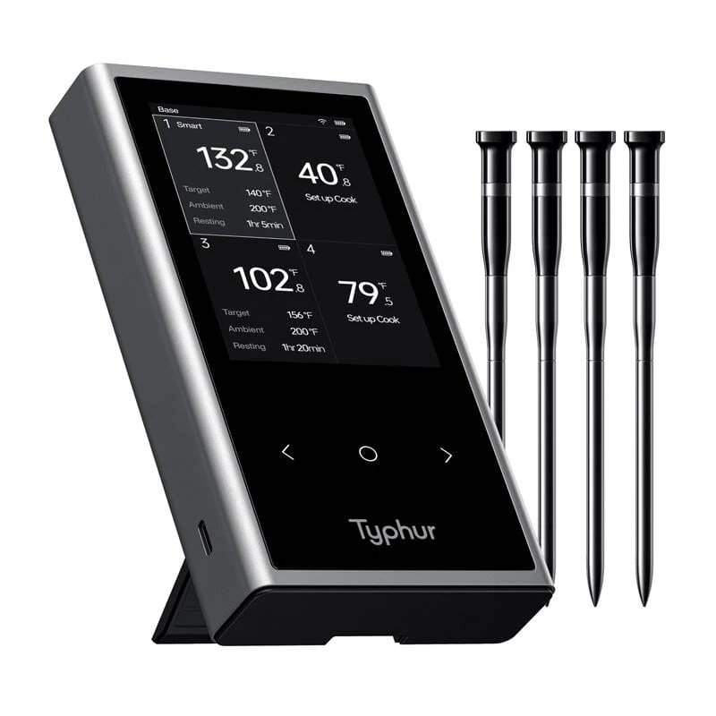 Typhur Sync Quad to nowoczesny termometr bezprzewodowy, który łączy doskonałą precyzję z niezawodną łącznością. Dzięki zaawansowanej technologii Bluetooth 5.3 oraz współpracy z aplikacją mobilną pozwala na dokładne monitorowanie temperatury z odległości do 400 stóp na otwartej przestrzeni lub 135 stóp w zamkniętych pomieszczeniach. Jest to niezastąpione narzędzie dla każdego, kto ceni perfekcję w gotowaniu.